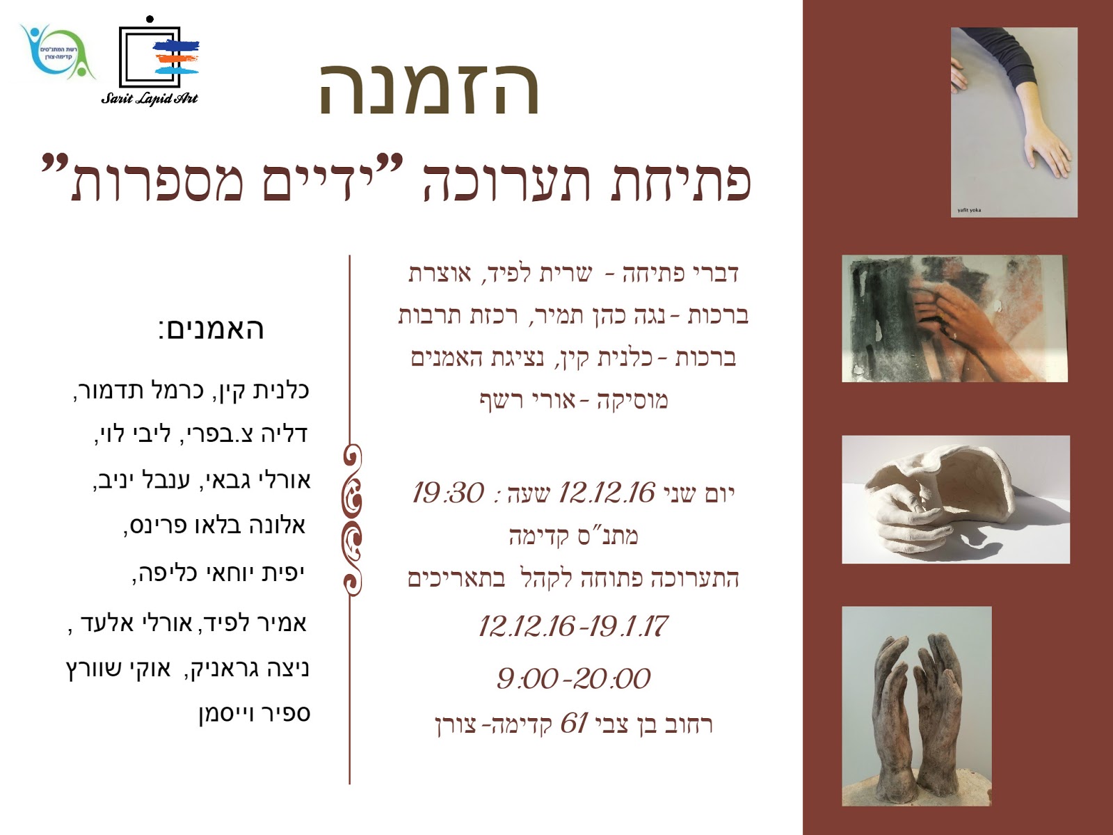 יום חמישי ה-19.01.2017 (עד שעה 20:00) הוא היום האחרון להצגת התערוכה "ידיים מספרות" – למה נבחר השם הזה? כי לכל יד יש סיפור. צריך רק להושיט את היד ולקרוא מה היא מספרת.