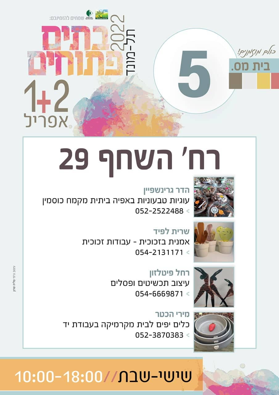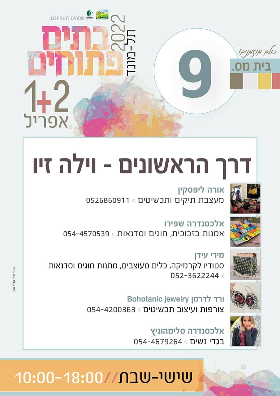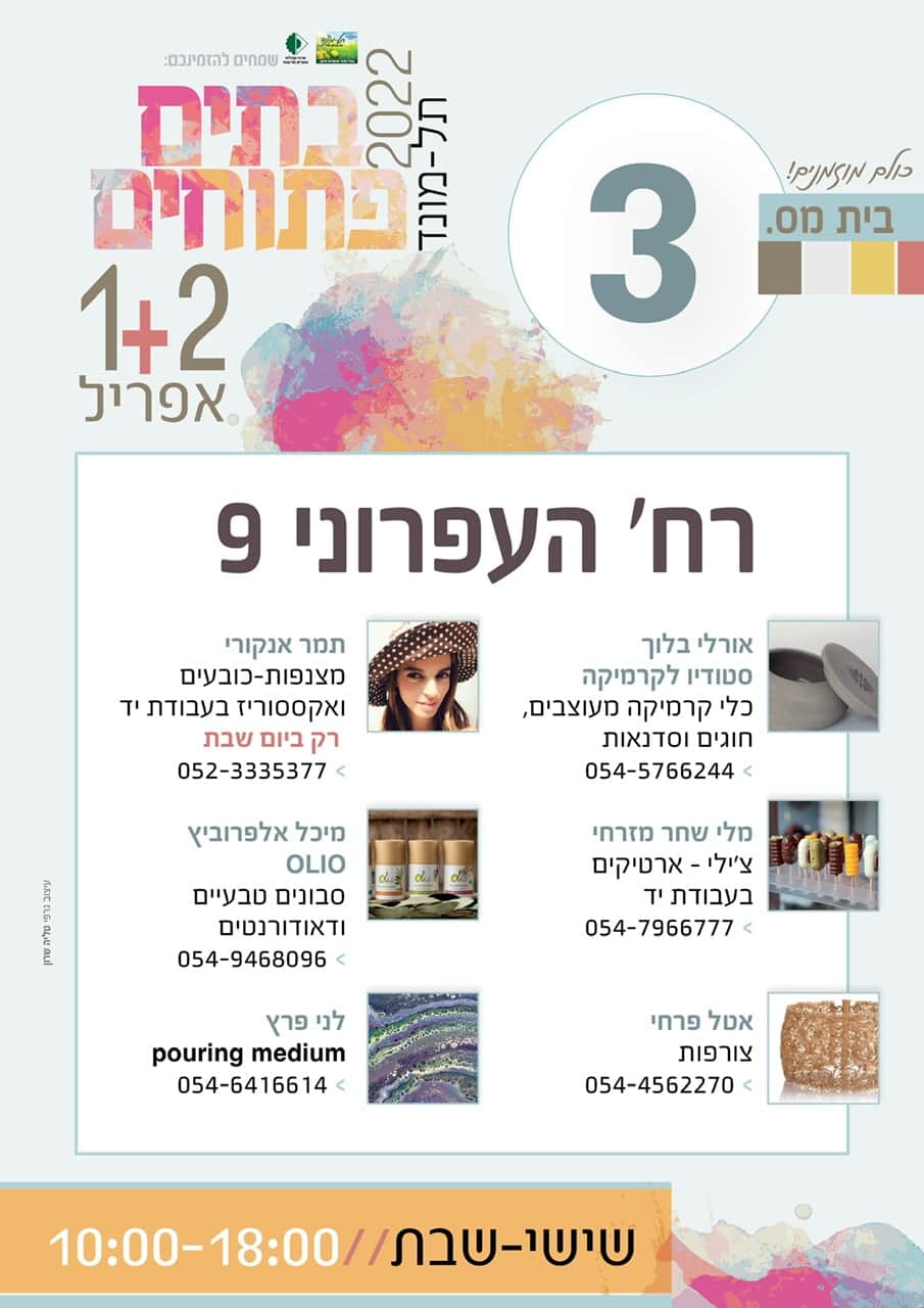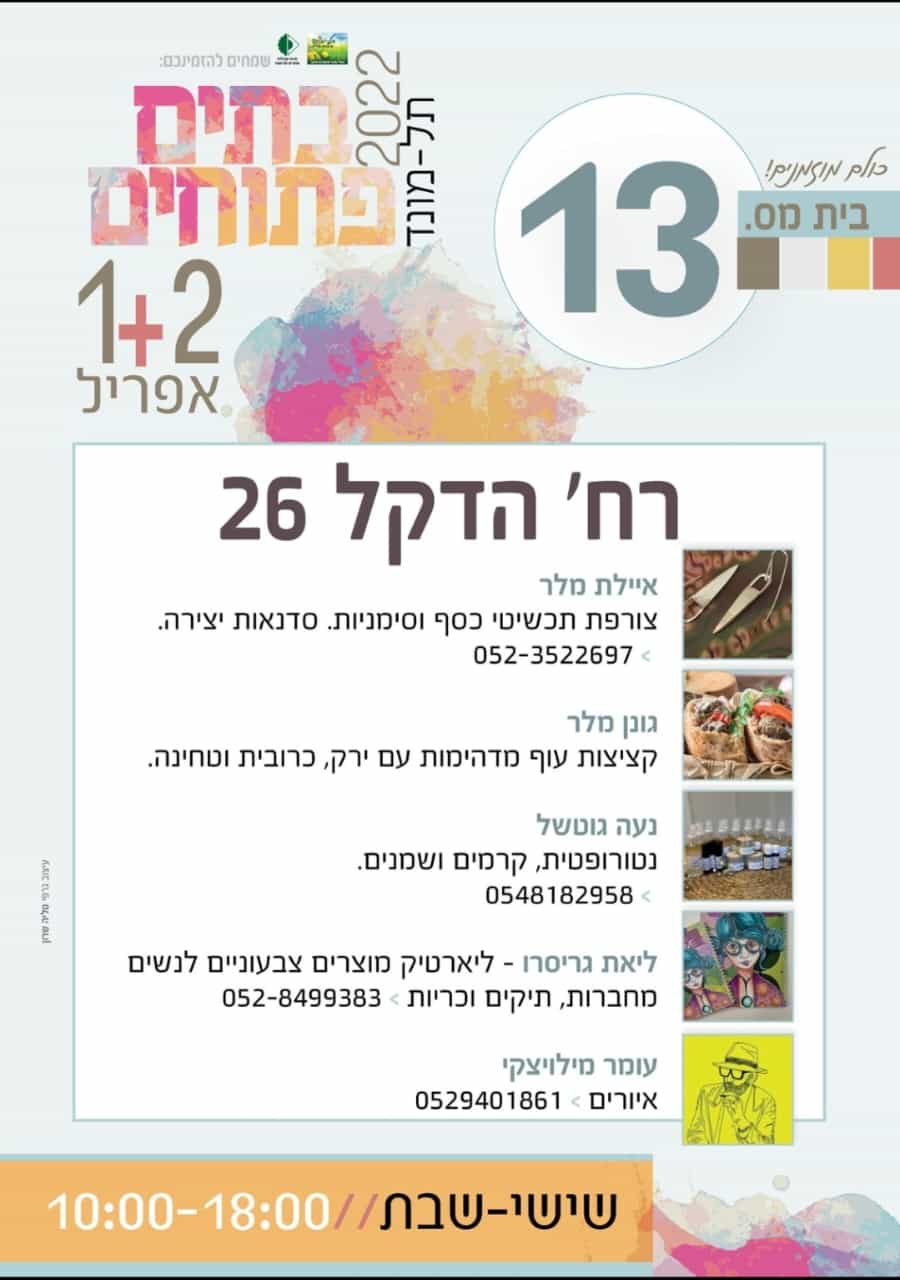 אמנים ויוצרים פותחים 22(!) בתים למבקרים ומבקרות מהאזור ומרחבי בארץ. כולן.ם מוזמנות.ים לראות, לשמוע, לטעום וליהנות ממבחר עצום של מתנות, מוצרים ויצירות, מזון, שתייה, טעימות מטיפולים אלטרנטיביים ואירועים ומופעים ברחבי המועצה/היישוב.