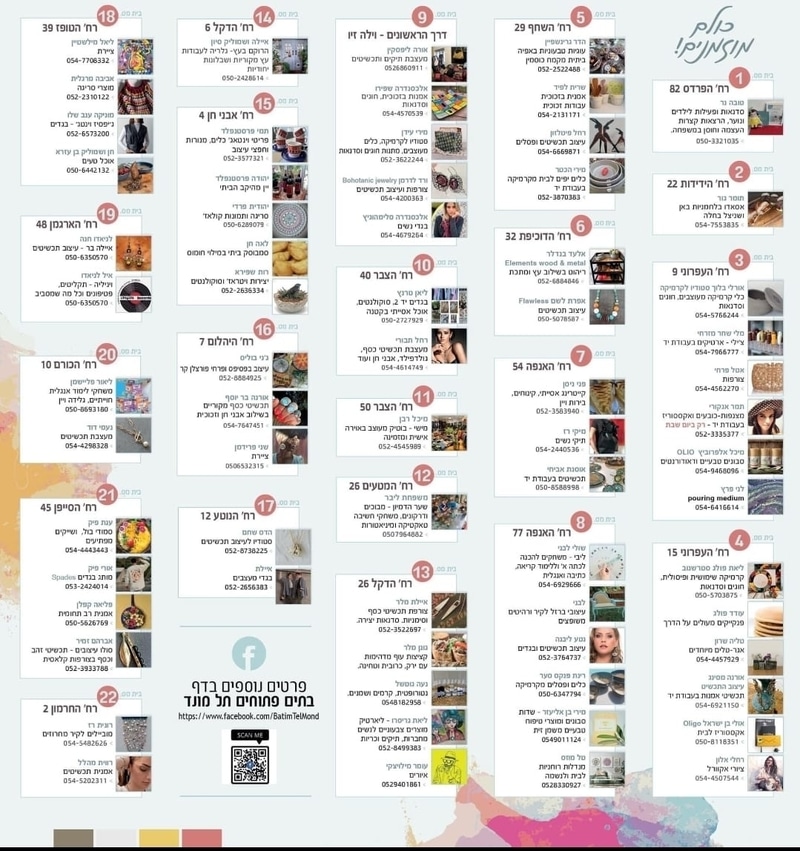 דף הפייסבוק של האירוע עשיר במידע, תמצאו בו את מפת הבתים והמציגים, פירוט של מי ומה בכל בית ואם יש שעות פעילויות שונות מהשעות הכלליות. זה אירוע הבתים הפתוחים הגדול באזור לב השרון.