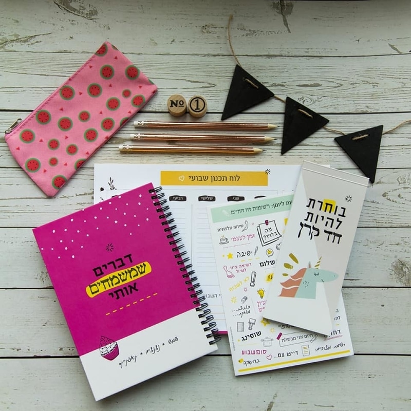מה לדוגמא? לוח תכנון שבועי, מחברות עם ספירלה וכריכה קשה מעוצבת (בפתיחה מימין לשמאל, עברית), מדבקות מהממות בעברית, פנקסים יפיפיים ומארזים עם כל הטוב הזה במבצעים מנצנצים.